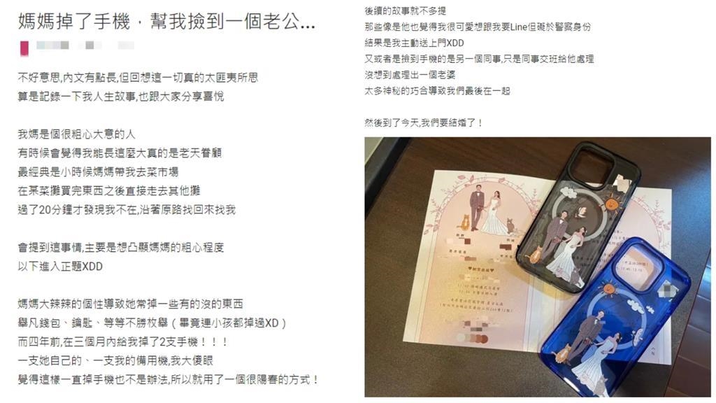 後來,媽媽的手機果真又弄丟被人送至警局,警方便透過手機上的聯絡方式,通知她到警局領回。然而當天值班的員警,正好是她喜歡的類型,因此她便主動展開追求,不僅成功要到對方的Line,相處過後竟真的在一起了。如今,2人即將步入禮堂,為了紀念這段奇妙的緣份,他們也用喜帖上的插圖訂製了一對手機殼,幸福喊到「還好我是主動的E人(?)才沒有錯過,也跟大家分享我的喜氣,許願單身的都可以順利脫單、交往的可以結婚。」