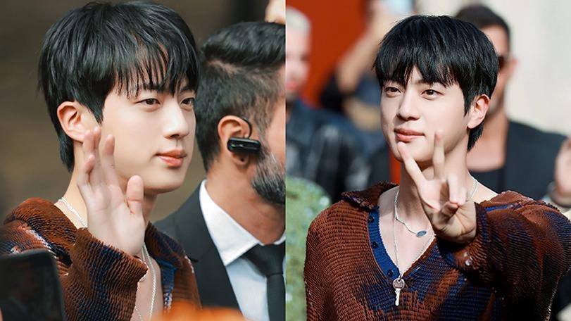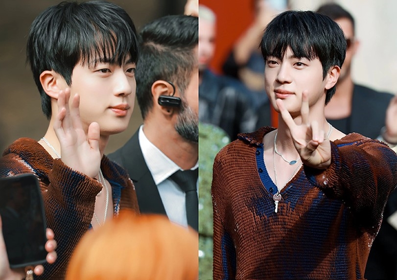 時裝週的 Jin 選擇棕紅為主、帶點深藍與亮澤的針織毛衣,V 領讓胸口精巧別緻的項鍊成了焦點之一;而鑰匙型吊墜更是為整體造型添上豐富的層次感。Jin 在鏡頭前表現得靦腆又愜意,輕鬆駕馭組合特別的打扮造型。
