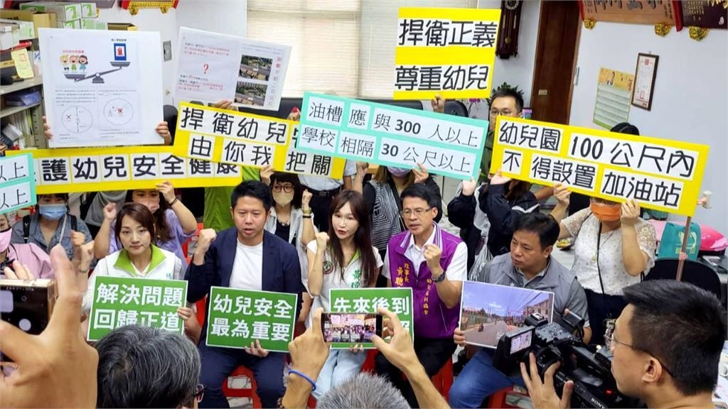 議員、幼兒園業者、家長,高舉看板,憤怒指控,怎麼可以在幼兒園,旁邊蓋加油站。