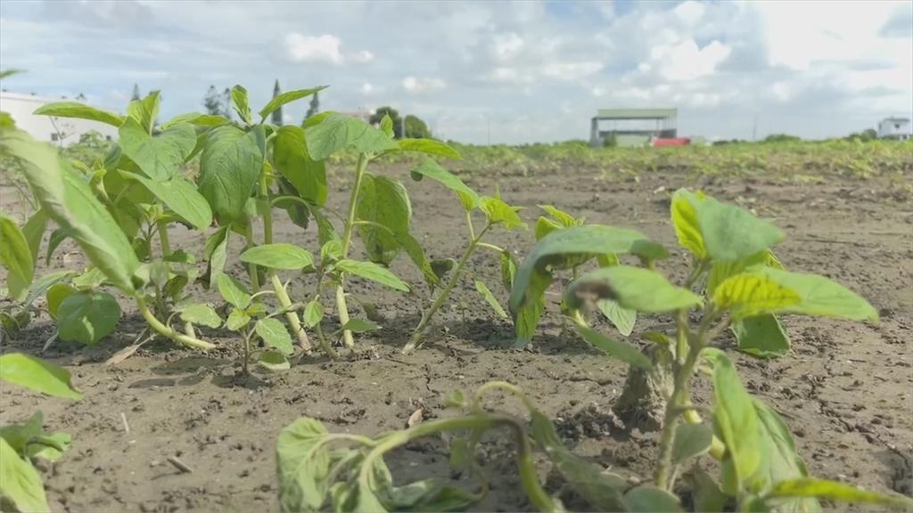 胡麻農民說,「這是胡麻這是雜草,現在胡麻被水浸到,就像這樣死掉了。」,「開始播種的時候,田裡就沒有乾過,就農地一乾了一兩天,就開始播種,種下去小苗就浸到水了。」