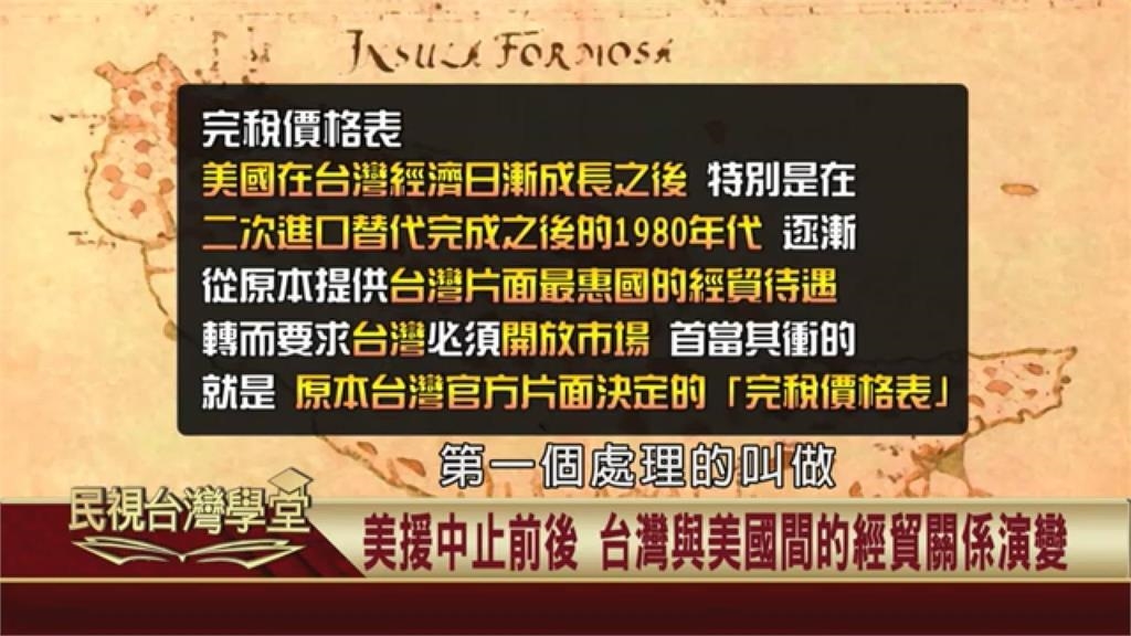 論壇中心/綜合報導1965年美援中止之後,台美之間的經貿關係有所轉變,美國變成台灣重要的外資來源,持續提供重要的經貿市場給台灣,不過到了1980年代,台美貿易逆差越來越明顯,於是美國要求台灣必須開放市場,首當其衝的就是台灣單方面決定的「完稅價格表」,在美國施壓之下,台灣持續降低關稅,物價也因此維持穩定。