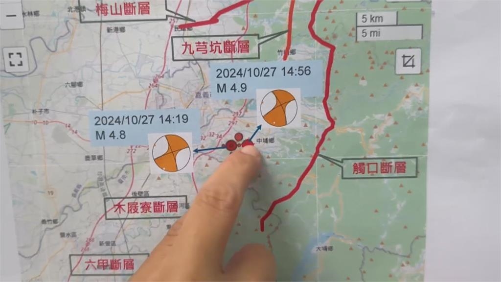拿起圓鍬在地上挖個小洞,把地震儀埋進去,嘉義中正大學地球與環境科學系的師生,在頻繁餘震下,來到蘭潭水庫,佈署地震感測器。中正大學地球與環境科學系教授溫怡瑛解說用途,「透過選址的位置,用這樣的地震儀做一些紀錄,之後可以去分析說這個地震序列有什麼樣的構造。」連續三天來,十一起的有感地震,震央都在嘉義中埔鄉,而且震央深度只有五到十公里,極為淺層,也讓民眾想到2017年5.1的地震。中正地球與環境科學系教授溫士忠指出,「2017年那次它剛好就介在九芎坑斷層跟六甲、木屐寮中間這個地帶,事實上也是我們昨天發生的位置。」