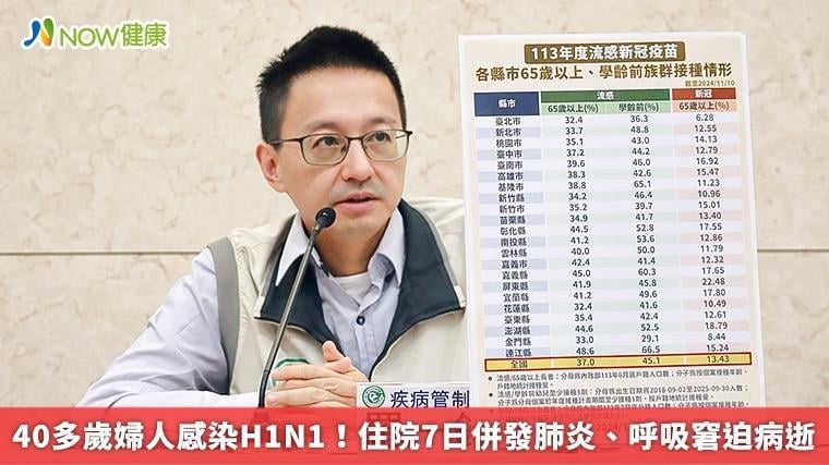 【NOW健康 陳郁茹/台北報導】國內自今年10月起至11月11日止,累計流感重症超過2百例,其中有26例死亡,人數已創下10年同期新高,疾管署今(12)日表示,最年輕的死亡個案為1名40多歲的婦人,沒有接種當季流感疫苗,10月中旬出現咳嗽有痰、呼吸困難,因症狀持續一週未有好轉而就醫,PCR檢驗感染H1N1,雖住院期間有使用流感抗病毒藥物治療,卻在入院第7日因併發肺炎及急性呼吸窘迫不幸過世。