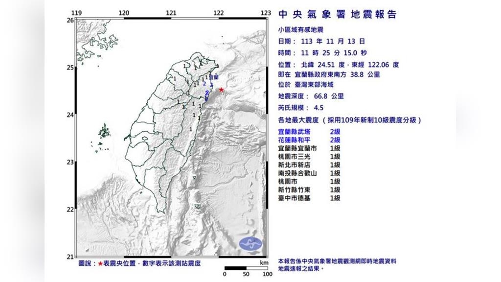 地震來襲!今日(13日)上午11時25分,宜蘭縣東南方38.8公里的台灣東部海域發生規模4.5地震,震源深度66.8公里,最大震度達2級,全台7縣市有感。