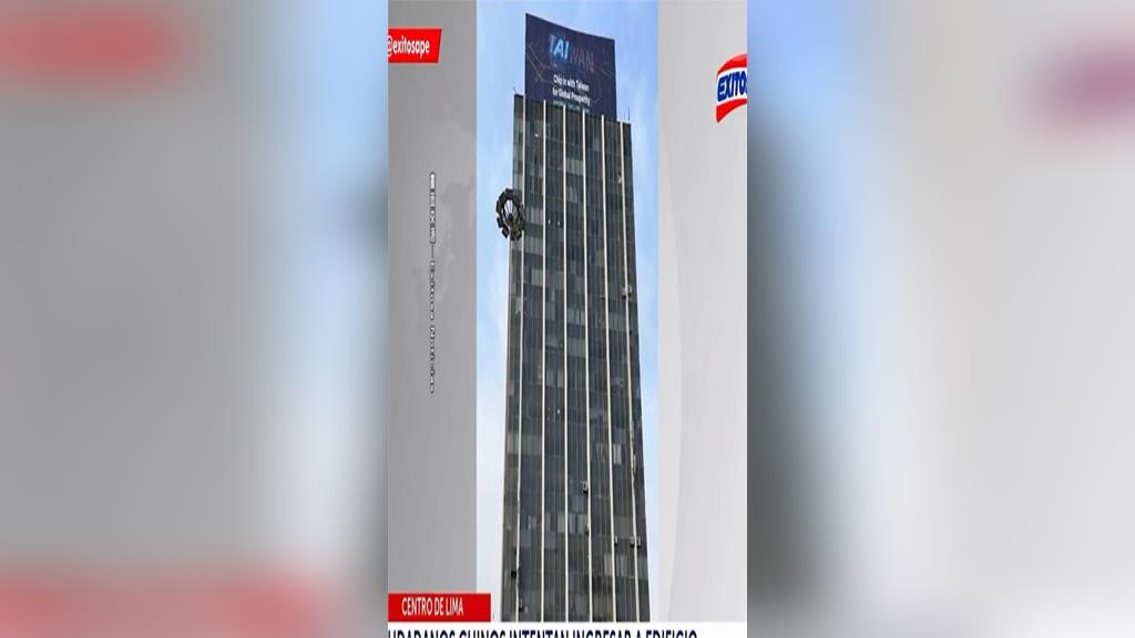 用口罩蒙面,17名中國人堵在利馬中心的一棟20層樓地標建築大門口,排成一排,企圖要闖入,要暴力強拆頂樓上方的大型''TAIWAN''看板,大樓管委會關閉出入口,緊急報警。