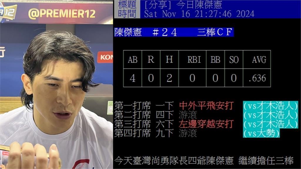 在昨晚的「台日大戰」中,陳傑憲排第3棒中外野手,對決日本隊先發王牌強投才木浩人,9局上辰己涼介敲出深遠飛球,台灣隊陷失分危機,陳傑憲守備時為接殺日本打者深遠飛球,直接撞上全壘打牆,成為台灣隊最後反攻,讓球場氣氛沸騰。面對強敵日本隊,陳傑憲依舊繳出了「雙安」的精出色成績,讓不少球迷為之折服,更有人在PTT發文盤點「四爺」昨(17日)晚的精彩表現,「今天台灣尚勇隊長四爺陳傑憲繼續擔任三棒,面對豪華陣容的日本隊,先是在一下面對阪神王牌才木浩人,擊出了本場第一支安打,在六下一壘有人的時候 更是打出第二支安打,將才木打退場」。