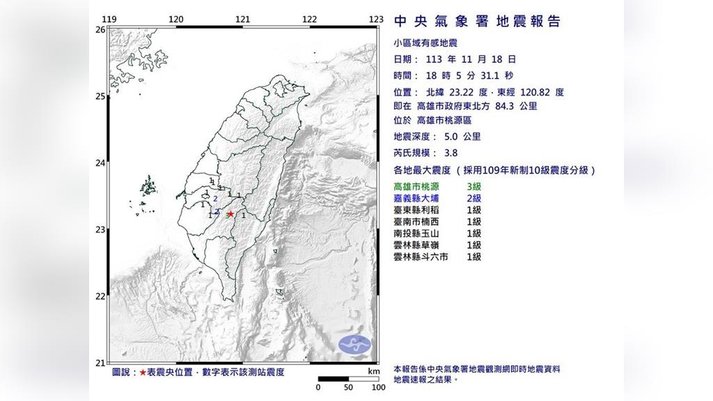 地牛翻身!今(18)日晚間18時05分,高雄市桃源區發生規模3.8的有感地震,深度僅5.0公里,最大震度3級。