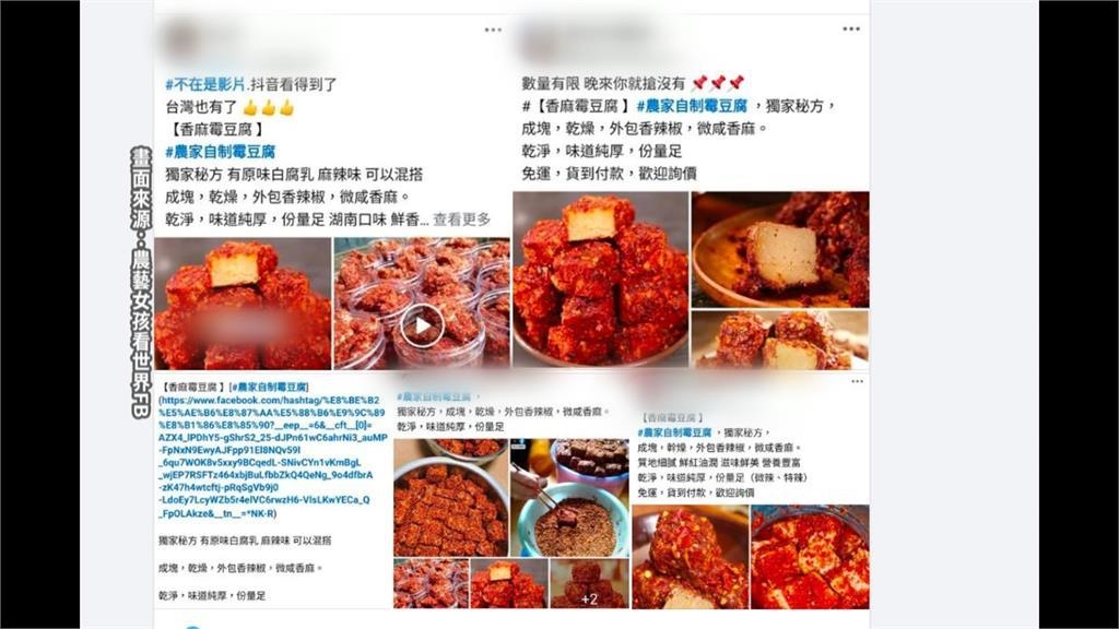 繼「中國蠟瓶糖」後,在中國流行的「香辣霉豆腐」透過抖音等方式傳進台灣,只是這款長滿霉毛的豆腐,加上辣椒醬等等鮮紅配料的製品,恐怕又是三無食品,更有臉書粉專提出警告,台灣沒有吃霉豆腐的習慣,擔憂對肝腎造成影響,衛福部也提醒販賣來路不明食品恐觸法,也請民眾不要在家自製,若吃進微量肉毒桿菌有致死風險。