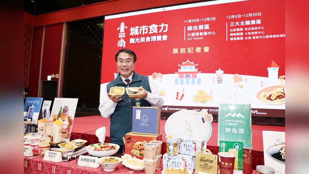 生活中心/台南報導為響應2024「臺南400」,台南市政府觀旅局以「城市食力」為主題推出「觀光美食博覽會」,繼37區巡迴移動展至本市各地暖身後,四大展區也緊接著登場,綜合展區將於11/29至12/2在大臺南會展中心開展,三大主題展區(山珍、海味及城食展區)則於12/5至12/20分別在官田遊客中心、七股遊客中心及永康臺南市立圖書館新總館接力展出。今(21)日舉辦展前記者會,由台南市長黃偉哲與宣傳大使徐凱希現場開箱分享展覽主題、展區地圖及觀展資訊等,議員許至椿也到場參與,歡迎全國民眾來博覽會吃美食、看展覽、抽大奬!