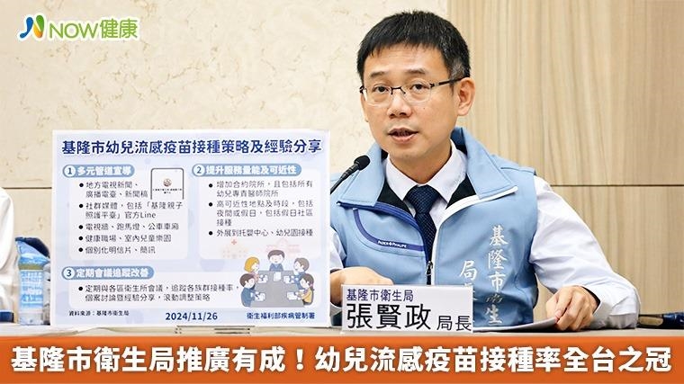 【NOW健康 陳郁茹/台北報導】「左流右新」自今年10月開打以來,基隆市的幼兒流感疫苗接種率超過7成,成為全台率先達標之縣市,基隆市政府衛生局局長張賢政今(26)日在記者會上分享,幼兒流感疫苗接種策略。疾管署也呼籲,隨氣溫驟降,呼吸道病毒將更活躍,請符合資格的民眾踴躍接種流感、新冠疫苗,有助提升身體保護力。