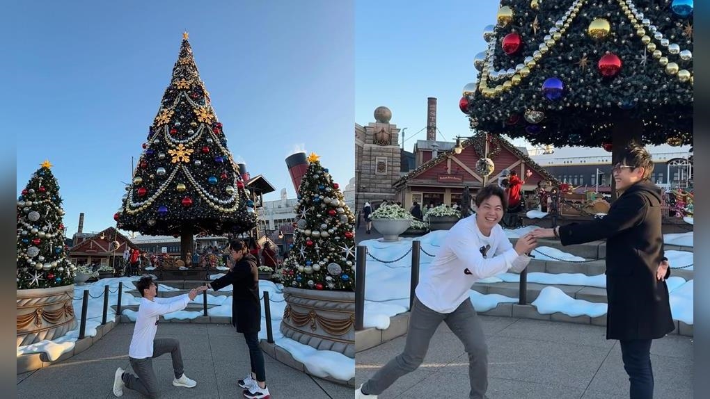 從影片中可見,兩人站在東京迪士尼聖誕樹前,郭俊麟笑地非常開心,單膝下跪向陳冠宇求婚,陳冠宇還故作嬌羞地摀嘴,畫面既浪漫又逗趣,可見兩人的好交情。
