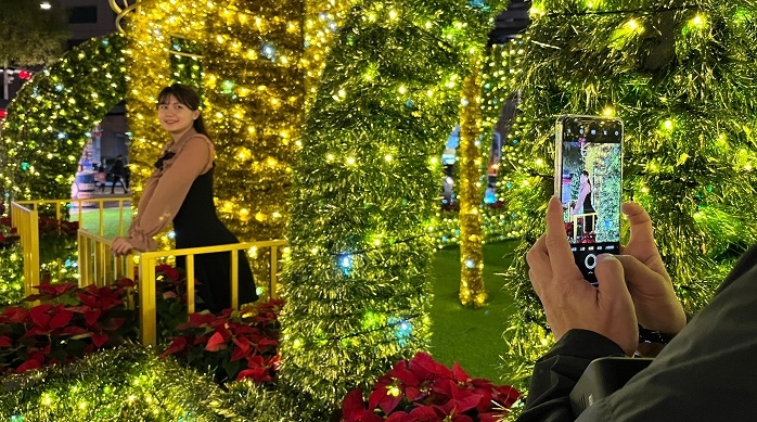 隨著耶誕季節到來,耶誕城周邊以多樣絢麗的天橋光廊與人行道燈飾,成為遊客必訪的拍照景點。官方攝影師鄭名宏(Justin Cheng)也分享幾個拍攝技巧,幫助遊客在熙攘人潮中拍攝出迷人的光影照片。以新府路天橋「蝶舞之森」為例,建議站於光廊中央,將手機與人物置於畫面正中,並開啟廣角模式將畫面延展,可藉此將站在模特兒後方約2公尺的遊客巧妙遮擋,並等待人群流動的空檔,即可拍攝出猶如空景的唯美照片。當人潮增加時,取景麗寶天橋「綺麗幻境」作為示範,拍攝時可蹲低身體,將攝影視角調整為由下往上,同時啟用廣角模式,讓天橋上端的絢麗燈飾變成背景,再加上模特兒自然互動的姿勢,便能輕鬆產出絕美氛圍照。拍攝層層交錯的璀璨人行道,如新站路的人行道裝置「無敵幸運星」,建議讓模特兒站立於一座燈飾裝置下,借用燈光提升臉部亮度,並將人物置於畫面中央,放大至兩倍以上。搭配手機長焦鏡頭的壓縮效果,不僅能使背景燈飾更加密集,畫面也會更具層次感與豐富性。