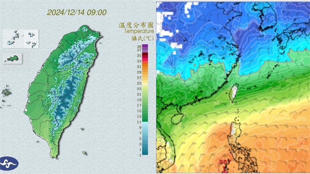 氣象專家吳德榮稍早在「氣象應用推廣基金會」專欄中指出,今(14日)晨截至6時13分,本島縣市平地最低氣溫落在新北石碇區,僅9.9度,而根據中央氣象署6時43分資料顯示,溫度再下修至9.6度;其餘桃園楊梅區10.4度,新竹湖口鄉10.6度、苗栗三灣鄉10.8度,台北文山、南港區也降至12.5度,各地區平地最低氣溫約在10至14度。今(14)日各地區氣溫,北部10至17度、中部12至22度、南部14至25度、東部13至26度。根據歐洲模式(ECMWF)模擬顯示,今(14日)晚至下週一(16日)清晨,部分平地最低氣溫將降至10度以下,提醒民眾注意保暖。下週一(16日)、二(17日)冷空氣逐漸減弱、氣溫緩慢回升,但北台灣仍偏冷,東半部偶有局部短暫雨的機率;下週三(18日)起另一股弱冷空氣南下,加入原已漸減弱的冷空氣,使得下週三(18日)至五(20日),北台灣的天氣以偏冷居多;下週末(21、22日)耶誕節前夕,則有較強的冷空氣南下,但抵達時間以及是否會再創低溫,都還不一定,應繼續觀察。