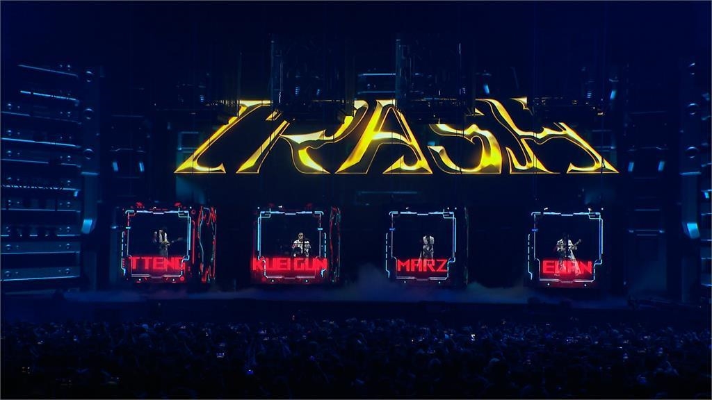 樂團TRASH"世界盡頭":「日子過了這麼久,怎麼還是很沒用」穿著一身白色暴走族特工服,站在玫瑰鋼琴旁,深情演唱,樂團TRASH成軍15周年,四名成員首度攻蛋,滿場上萬名歌迷力挺,氣氛超級嗨。樂團 TRASH"懦弱":「來掩飾內心的懦弱,才明白,這就是命中註定的你和我。」不論招牌抒情歌,還是搖滾轟炸,應有盡有,讓台下歌迷聽得如癡如醉,主唱阿夜不只會唱歌,更幽默地開起歌迷玩笑。