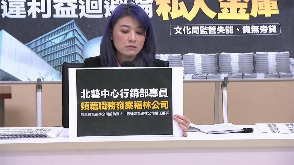 拿出一張張圖資及標案資料,指控北藝中心一名行銷部行銷部趙姓專員,從2021年北藝中心掛牌以來,北藝中心試營運宣傳片,再到2022年開幕形象片、空拍形象片等等,三年間將9個共300多萬元的標案,發包給"福林制映所股份有限公司",該間公司的負責人竟是趙姓專員的妹妹,涉嫌違反利益迴避、圖利,但北市府渾然不知!北市文化局藝術展演科股長蔡佳穎:「採購案方面的監督,我們目前主要是依據政府採購法第4條,就是法人或團體,它在接受我們機關補助辦理採購的時候,如果它的補助金額佔採購金額半數以上,而且補助的金額在公告金額以上的話,它就適用政府採購法的規定,議座所提到採購案的部分,比較屬於小額的採購,它就會適用北藝中心採購的規章。」