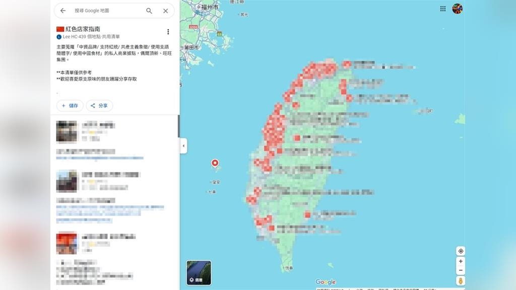 有網友在Google地圖上製作的「紅色店家指南」,目前共有437家不同行業的店家被列入,而這份名單的判斷依據則是,只要是中資品牌、支持紅統、有共產主義象徵,或是使用簡體字、中國食材等條件就會被列入清單,發起這分名單的網友還在簡介中表示「本清單僅供參考」、「歡迎喜愛原支原味的朋友踴躍分享存取」。從這張地圖中可以看到,台灣的西半部幾乎每個縣市都有「紅色店家」的蹤跡,只有花蓮縣目前還沒有網友將店家紀錄進去。