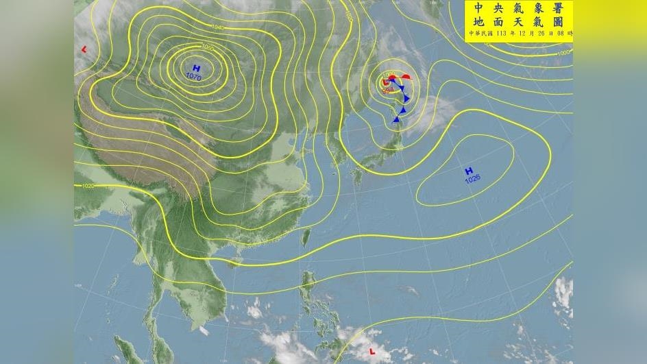 中央氣象署指出今天(26日)東北季風增強,桃園以北及東半部地區有局部短暫雨,北部地區及中南部山區有零星飄雨,其他地區及澎湖、金門、馬祖為多雲,溫度方面,北台灣約20度左右,相較於今天稍轉涼,而其他地區高溫23至27度,感受上舒適至溫暖;對此,鄭明典在臉書發文表示,衛星雲圖中看到高氣壓達1070百帕,是今年入冬以來分析場出現的最高氣壓,不過由於北半球平均還是顯著偏暖,冷空氣勢力還是相對弱勢。
