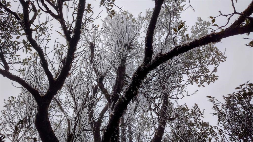 從現場的畫面可見,太平山內一陣雲霧茫茫,樹木與山嶽被朵朵白雲給環繞,氣溫相當低,而部分樹枝、樹葉上的水滴已因嚴寒而結冰與結霜,夢幻的場景讓人讚嘆。