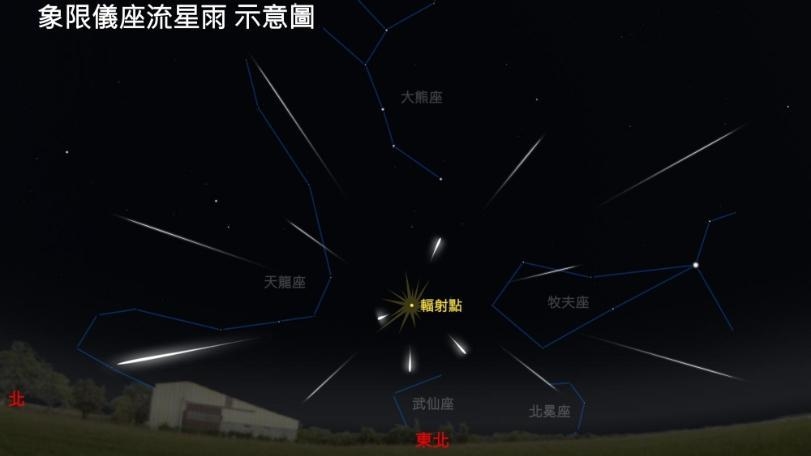 根據國際流星組織(IMO)最新預測,今年的象限儀座流星雨極大期落在1月4日凌晨2時前後,每小時天頂流星數(ZHR)上看120顆,臺灣正位於這次流星雨的最佳觀賞帶上。象限儀座流星雨輻射點於4日凌晨0時30分於東北方升起,之後流星數量將逐漸增多,且當晚無月光干擾,觀賞條件極佳,在視野開闊、無光害的地點,直到天亮前都有機會看到大量流星。