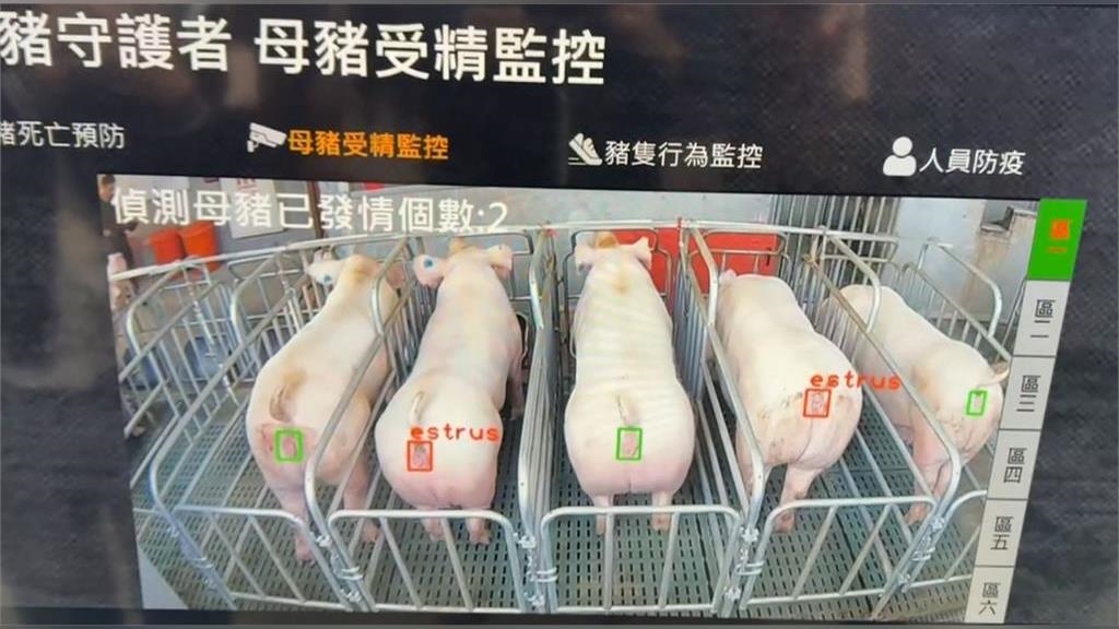 好幾隻母豬被單獨關在柵欄裡,電腦有的紅框框、有的綠框框,原來是在觀察他們有沒有發情,過去母豬何時該受孕,靠的是豬農天天巡視判斷,宜蘭大學AI推動辦公室研發一套系統,讓電腦來幫忙偵測,達到最完美的配種時間。另外母豬分娩後,生了十幾胎,不過在養豬場,常發生豬寶寶被母豬壓死的意外,這套母豬AI生育技術,可以偵測到母豬是否站立,或是豬寶寶被壓到時的叫聲。