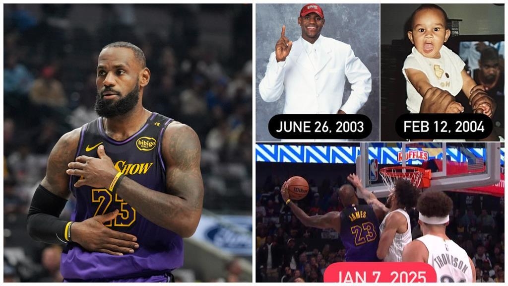 12月30號剛滿40歲的詹姆斯,在2003年6月26號以選秀狀元身分投身NBA,至於「海報男配角」里夫利則是2004年2月12號才出生,2023年選秀會首輪新秀,目前效力獨行俠第二個球季。美國媒體《露天體育看台》在社群平台分享一張梗圖,不僅有上述兩個時間點雙方獨照,還將隔扣精彩照片拼圖,發文一小時已經有破萬人按讚,與上千條轉推。