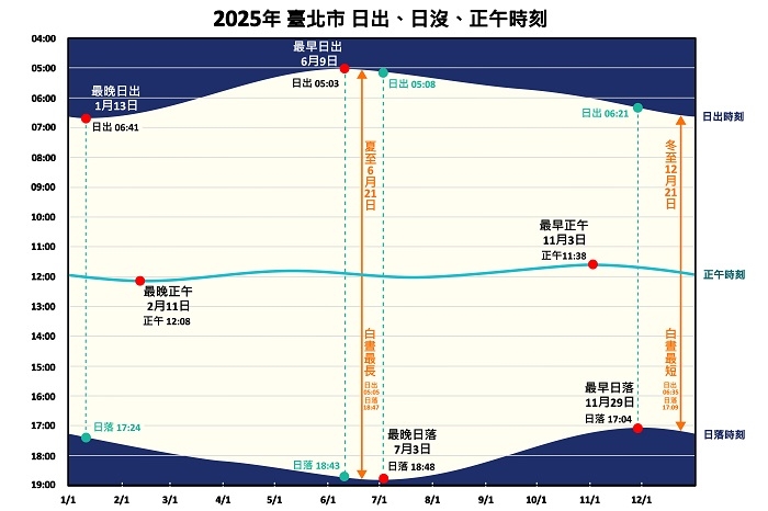 一般常以為「冬至」是最晚日出、最早日落的日子,但事實上冬至只是白晝最短的一天,至於最晚日出的日期則受到地球自轉軸、繞日公轉軌道與地理位置等因素影響而不同。臺灣大約落在1月中旬左右;相對地,最早日出也不是在夏至,而是6月上旬的5時整左右,比起1月中旬的日出時間足足早了超過1個半小時,對民眾的日常作息頗具影響。若想精算所在位置的日出、日落時刻,歡迎使用臺北天文館網站的「天象導航通」互動網頁查詢。