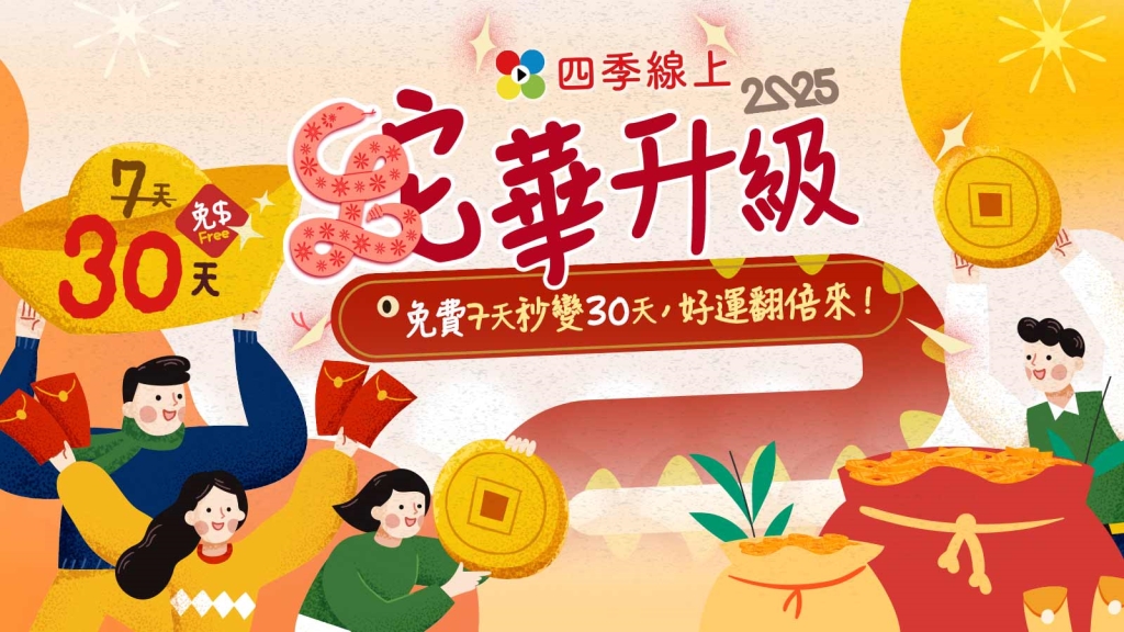 新年特別企劃!免費看片升級! 1/17-2/18期間註冊四季線上會員 7天免費試用直接升級為30天免費觀看 蛇華升級 好運翻倍來
