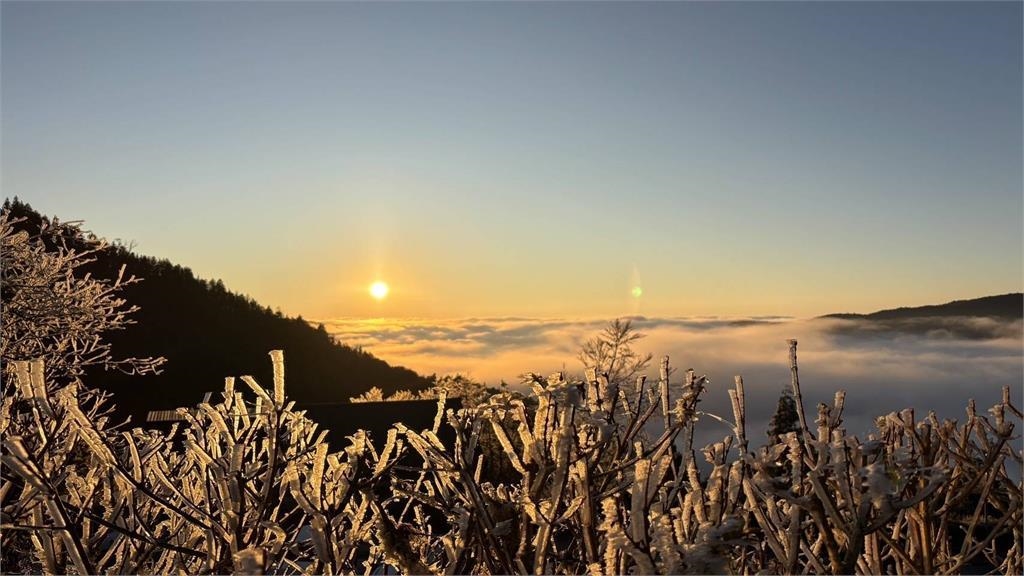 今宜蘭太平山在清晨氣溫僅降至攝氏零下1度,未達冰點,但局部木棧道上仍覆蓋薄霜,部分樹木枝條也出現了短暫的霧淞現象,與耀眼日出和壯闊雲海共同構成冬季限定的夢幻畫面。