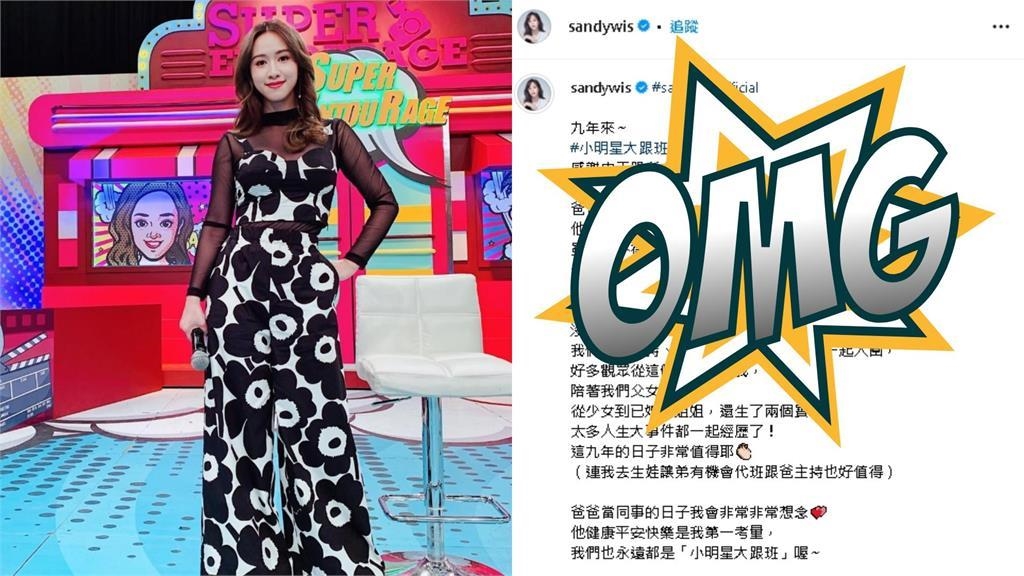 今(19日)Sandy在IG發文證實《小明星大跟班》即將停播,她透露其實吳宗憲因為太忙、太累,已經請辭多次。雖然她捨不得一起錄影的時光,但身為女兒的她,每次看到吳宗憲因為工作如此辛苦,心裡非常心疼。Sandy接著表示節目開播這9年,是非常值得的日子,與吳宗憲一起主持、一起得獎、還再次一起入圍,許多觀眾是因為這個節目認識她,而在主持的這段時間裡,還歷經了幾個人生的重要階段,從結婚到現在已是兩個孩子的媽。