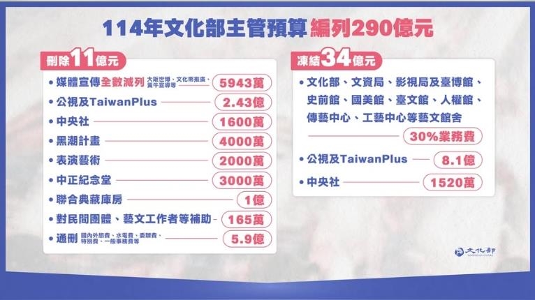 文化部也透過新聞稿指出,114年中央政府總預算今日三讀通過,文化部主管預算原編列290億元,經初步計算共刪除11億元、凍結34億元。