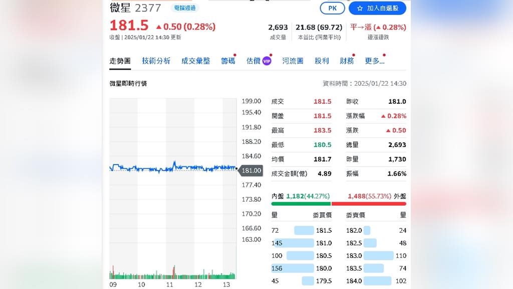 微星(2377)在龍年台股封關日收盤 181.5 元,單日小漲 0.28%,外資就買了1488 張,顯示市場對其未來成長動能仍具信心,隨著輝達(NVIDIA)在CES 2025展上發表全新 Blackwell GPU架構的GeForce RTX 50系列顯卡,市場看好這將帶動新一波換機潮,微星 2024 年 11 月營收已達近三年同期新高,累計前 11 個月業績更超越 2023 全年表現,法人預測,微星 2025 年全年營收有望挑戰 2021 年創下的 2018 億元歷史新高,在 AI 伺服器與電競市場雙動能推動下,微星正站在新一波成長浪潮上,2025 年業績可望再創高峰。
