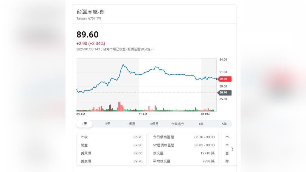 財經中心/綜合報導春節出國旺季,讓國內航空公司業績大好,根據台灣虎航(6757)日前公告的2024年12月營收近13億元,月增10.15%、年增13.97%,創同期新高;總計全年營收164億元、年增31.7%,創歷史新高。尤其虎航是飛航日本、韓國最多航點的國籍航空,在2024年11月開航第20個日本航點宮崎之後,2025年1月21日又開航高雄-新千歲航線。隨著滑雪及農曆新年傳統出遊旺季到來,從已售出及旅遊業成團情況觀察,整體旅遊市場需求暢旺,可望帶動一月營收表現繼續衝高。因此虎航在股市封關時,以89.6元作收,上漲2.9元,站上航空股王的寶座。