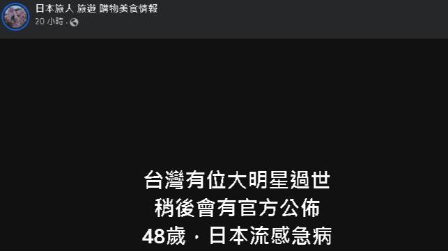 時常分享日本資訊的粉專《日本旅人、旅遊、購物美食情報》昨日無預警使用黑底白字發文,寫下:「台灣有位大明星過世,稍後會有官方公佈,48歲,日本流感急病。」後續更在留言區公布關鍵,稱是「流星花園」年代的明星、以及性別是女性、已婚,還稱遺體就快要火化。
