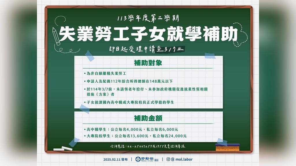 勞動部今(11)日表示,為減輕非自願離職失業勞工子女就學負擔,勞動部辦理失業勞工子女就學補助,113學年度第2學期補助自今日開始受理,至3月7日截止申請。
