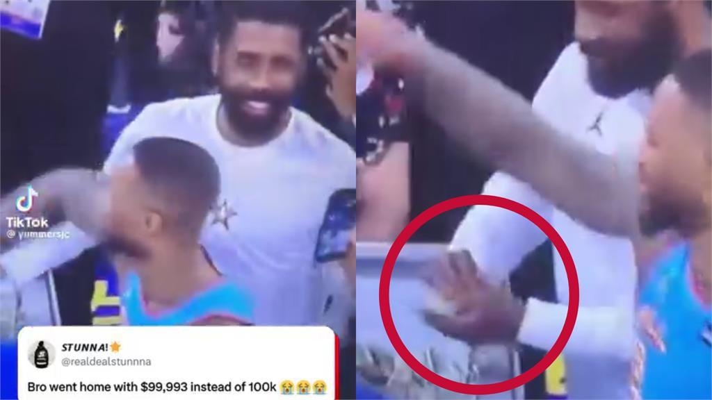 在今年NBA全明星正賽場中Logo shot遊戲,一位18歲大學生杰倫(Jaren Barajas)擊敗公鹿球星里拉德(Damian Lillard)抱走10萬美金(約新台幣327萬元),正當杰倫開心跳進獎金池、享受鈔票浴時,轉播畫面捕捉到獨行俠全明星厄文(Kyrie Irving)默默摸走幾張鈔票,被眼尖網友發現po上網笑稱:「這位大學生少帶了7塊美金回家。」