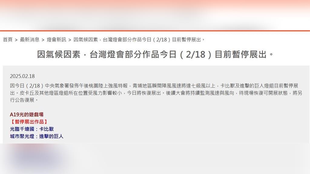 桃園市政府今(18)日稍早表示,受天候影響,台灣燈會活動現場的青埔地區預估有7級以上陣風,卡比獸、進擊的巨人等燈組18日暫時暫停展出,其他燈組正常展出。不過後來於現場觀測風勢轉小,皮卡丘、巨大卡比獸也恢復展出。