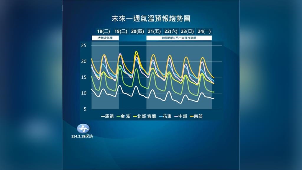 週四白天溫度再暖一點,將會是未來一週最暖和的時候,伍婉華預估,整個西半部高溫約24度,金門和澎湖17至18度,馬祖14至15度,但隨著鋒面南下後帶來一波波冷空氣,週五、六受一波冷空氣影響,週日至下週一又再有冷空氣持續南下,各地溫度、低溫都逐漸下降。目前預估下一波大陸冷氣團最冷的時間,可能在下週一清晨,比明日清晨低溫再低1度左右。