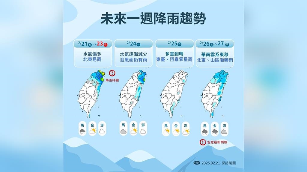 下週一,水氣逐漸減少,迎風面仍有雨,桃園以北、東半部有降雨,但雨勢跟前幾天比,有逐步緩和趨勢。下週二,多雲到晴,東台、恆春零星雨,是未來一週天氣相對最穩定的時候,各地恢復多雲到晴天氣,只有迎風面東半部、恆春半島零星降雨。下週三至四,華南雲系東移,北東、山區漸轉雨,北部、東半部甚至山區有零星飄雨,只是下週三後目前水氣變化,預報還是有很大不確定性,天氣要隨時留意天氣預報。