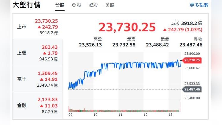 台股21日開高走高,收於23730.25點,上漲242.79點,漲幅1.03%,成交量3911.36億元,三大法人買超172.82億元。統計三大法人買賣超情況,外資買超178.87億元,投信賣超48.05億元,自營商買超42.01億元。