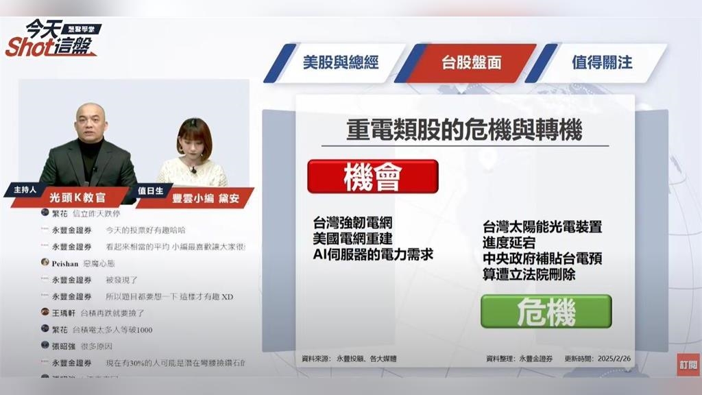 美國科技類股動盪,台股電子股同步走弱,就類股漲跌的幅度觀察,今天大跌幾乎都是電子類股貢獻!但在電子股相對弱勢的當下,中鋼、大成鋼、台泥及台塑四寶等老牌傳產類股卻齊步走高,這是資金轉向? 還是資金尋找跌深個股暫時停放呢?永豐金證券今天Shot 這盤,盤前重點一把抓提到市場最新個股動態,並分析美股漲跌的主因與重電類股的危機與轉機。
