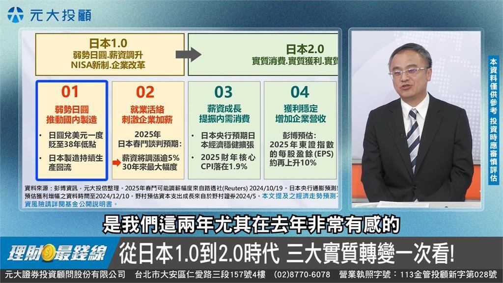 日本經濟有感轉熱,邁入日本2.0投資人該怎麼操作?元大投信基金經理人陳品橋表示,兩年前我們就一直在講,日本要走出失落30年,我們真的看到五步驟日本政府一步步規劃實現的,理財最錢線主持人胡睿涵帶您一次瞭解。