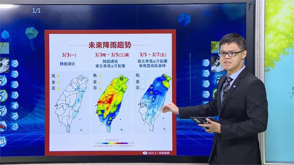 溫度部分,曾昭誠表示,受偏南風影響,今日到下週一白天高溫逐日升高,有機會來到25至30度,特別是下週一鋒面來的前一刻,各地可能都是30度左右溫度,但早晚還是偏涼。下週二開始,東北季風南下或可能到大陸冷氣團強度,北部、宜蘭白天溫度下降較明顯,從原本30度到週二白天可能掉到20度上下,中南部溫度可能稍微下降一點。