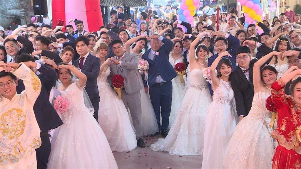 小朋友穿著西裝、白紗洋裝,在台上隨著音樂起舞,為集團婚禮揭開序幕。台中樂成宮,2日舉行第八屆集團婚禮,新人手牽手依序走進會場,完成終身大事。