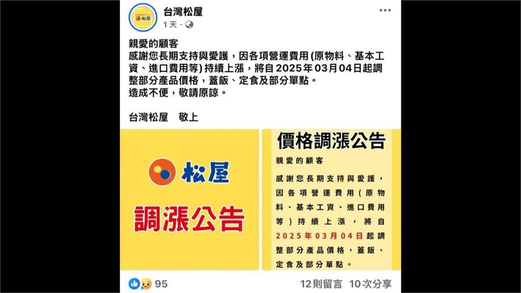 調味過的豬肉片,淋上金黃起司,撒上海苔點綴,簡單一碗日式起司豬肉蓋飯,現在想吃上一份,得多掏點錢!平價牛丼品牌松屋,在臉書上發出公告,周二開始,24個品項皆調漲!如蔥香鹽豬燒肉蓋飯套餐,從139元漲到145元;蜜汁牛燒肉定食套餐,從230元漲到250元。統計定食系列上漲10到20元,蓋飯系列也跟著漲5到16元,原因是各項營運費用增加,才會調整價格!民眾:「現在物價也很貴啊,他也很難做了,加10塊的話如果他水準沒有變的話,我會繼續去吃」。民眾:「他也要賺錢嘛那這10塊很少錢,10元不是很多,而且這間也蠻好吃的」。民眾:「10塊目前還好,所以我覺得應該是可以的」。