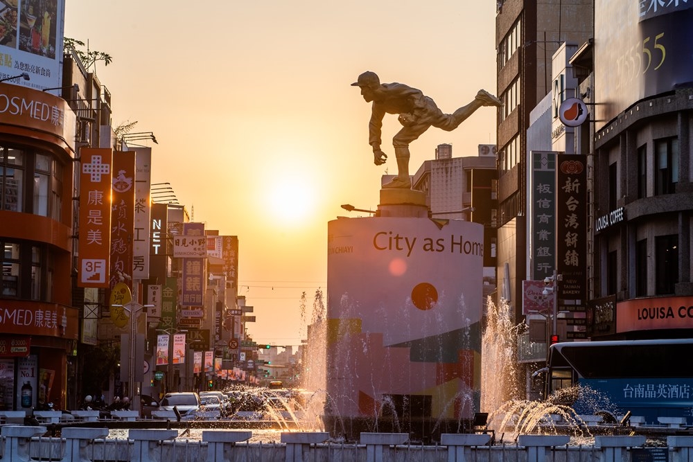 懸日景象雖不少見,但只有在棒球原鄉嘉義市,能拍攝到矗立中央噴水池的吳明捷投手投出「懸日好球」的景象,歡迎民眾來嘉賞懸日、品嚐美食!