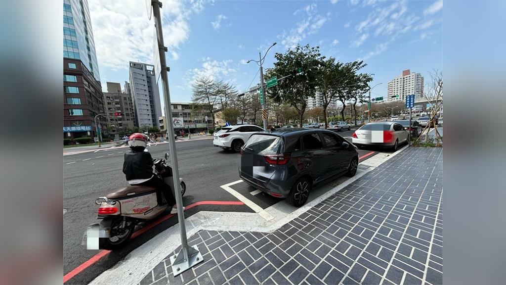 忠明南路最近新鋪道路,標線也重新繪製,從制高點往下拍,可以清楚看到,這個待轉區的大小跟形狀,跟前面停車格幾乎一樣,但格子內明明有畫箭頭,卻被汽車占用停車,讓路過騎士直呼瞎爆了!