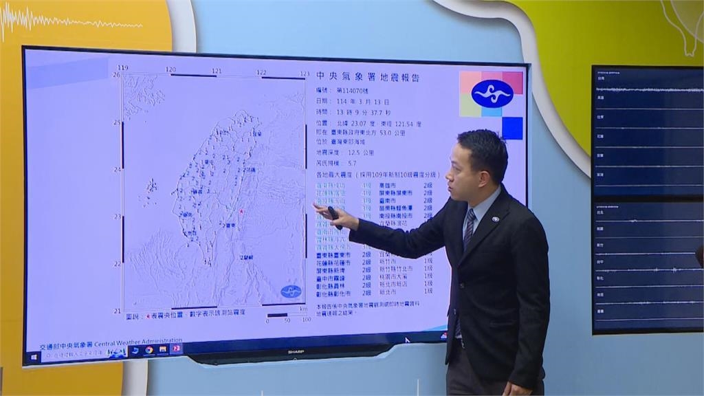 台東外海於今(13)日下午1時9分發生規模5.7的有感地震,深度12.5公里。全台17縣市均能感受到搖晃。中央氣象署地震測報中心科長廖哲緯說明,本次地震為獨立事件,不排除未來1周還有規模4或規模5以上地震。