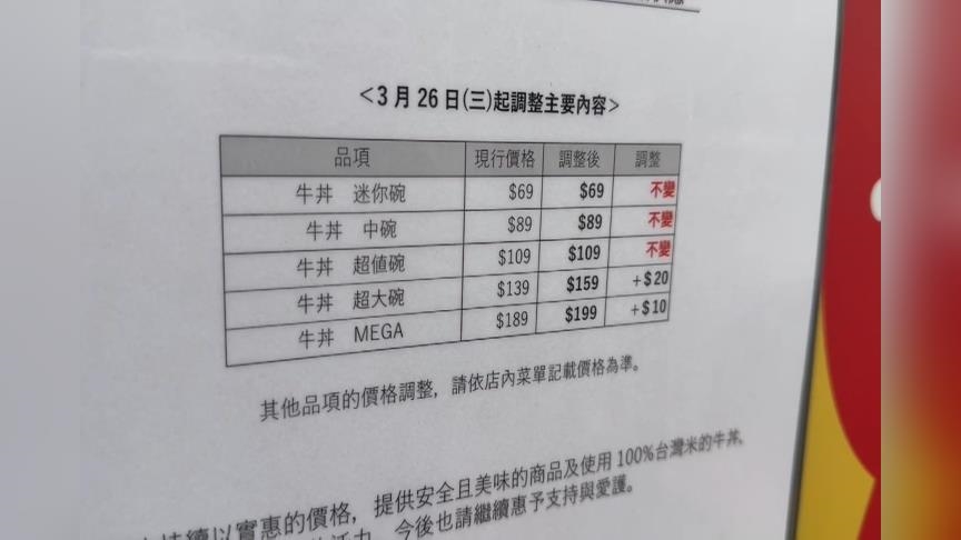 進軍台灣10年的Sukiya,門口張貼公告,說是因為牛肉長期價格高漲,3/26開始,超大碗牛丼漲20元,漲幅1成左右,MEGA款貴10塊,部分項目平均漲4元,這樣的漲幅外食族能接受嗎?民眾說嚇死人了,因為我每天都固定一百塊錢。民眾表示不合理這當然不合理。