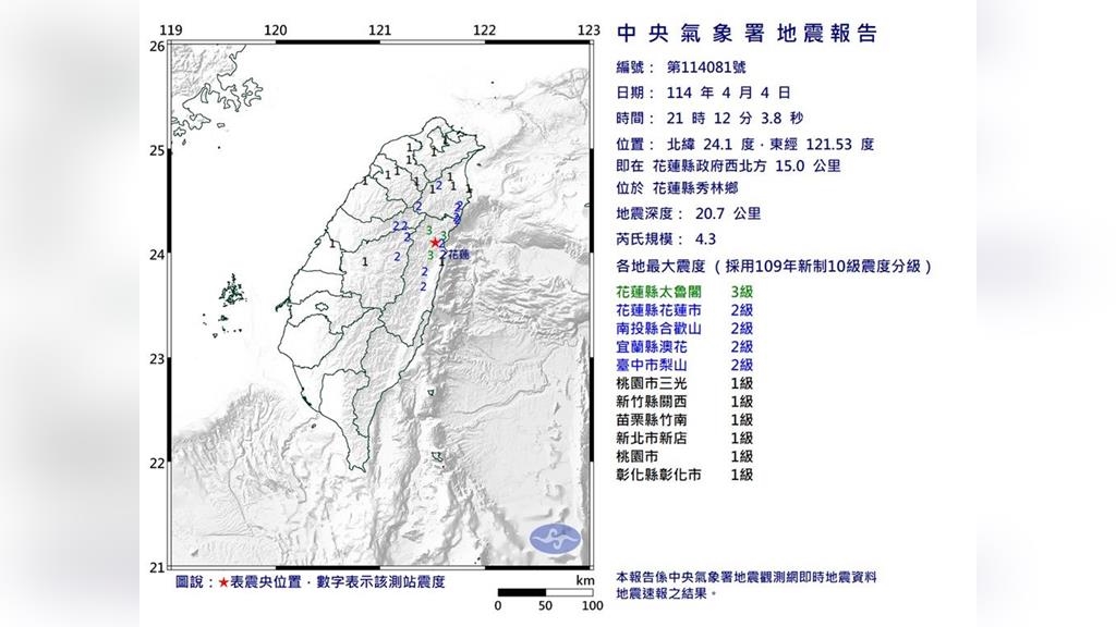 即時中心/廖予瑄報導台灣東北部今(4)日21時12分發生有感地震,芮氏規模4.3,深度為20.7公里,最大震度花蓮縣太魯閣3級。