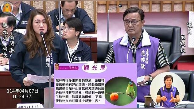山地原住民議員范織欽說道,茂林消防分隊對面有一大片公有地,很適合飼養熊、山羊、山羌、水鹿等東南亞野生動物,也比較能做到人性化飼養。他強調壽山那邊太熱,環境不太適合,被關在牢裡的動物被海風一吹毛就脫光光。他也已經提過好幾次這個想法,更表示,如果觀光局有意願,他願意親自帶專家一起去看現場。